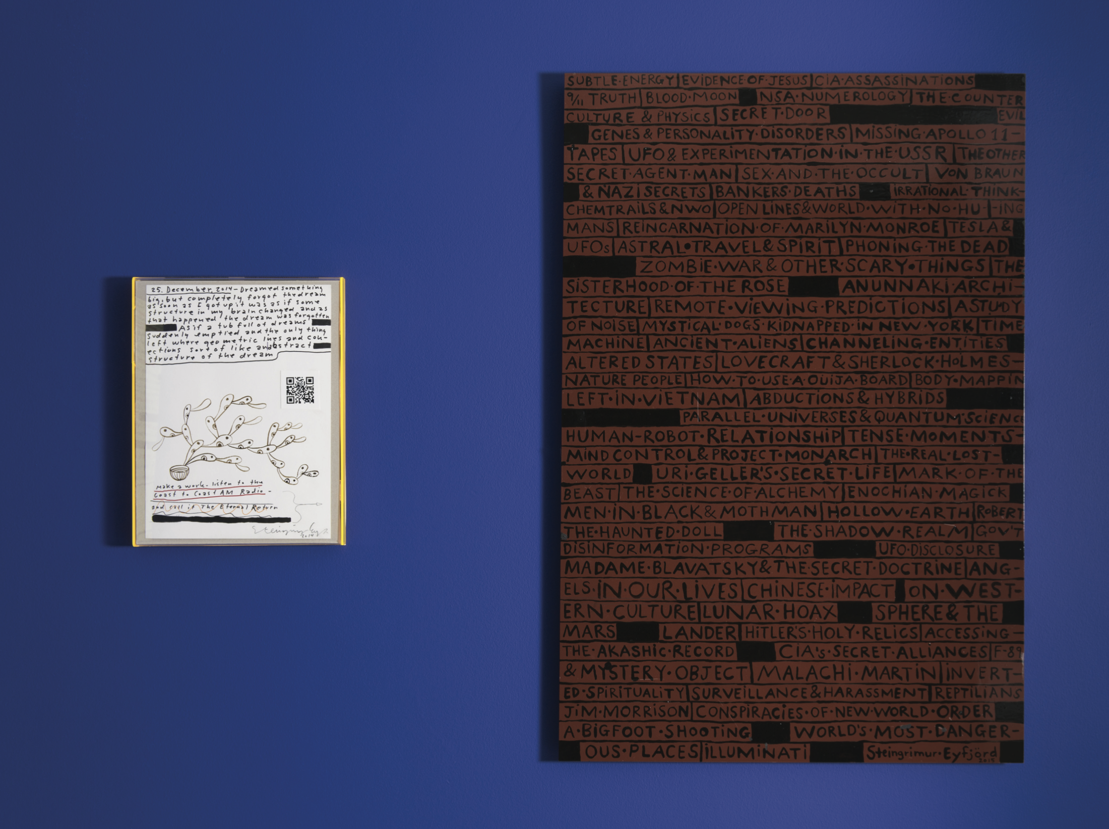 Steingrímur’s exhibitions are usually full of texts and many of the artworks are primarily composed of handwritten texts, sometimes accompanied by images or drawings. This presentation has its background in the artistic environment that he was part of in the 1970s in Iceland, around the gallery and collective known as Suðurgata 7, which was heavily influenced by the Fluxus movement. He later completed his studies in the Netherlands where similar influences prevailed. But his use of text also brings together the many treads of his complex and highly individual working method. The artworks become documents of their own creation, reflecting the methods that Steingrímur has used to come to the result that we see in the exhibition. They document a journey where he has delved deep into his subject in order to understand it. This journey is subject to certain rules and the artworks also often involve rules – explicit or implicit – that the viewer has to follow. We are given instructions that allow us to discover the subject for ourselves or add our voice to the narrative. Steingrímur has even harnessed the Internet to this exploration by including QR codes in some of the pieces that we can read with a smart phone to find web sites where we can continue the quest.