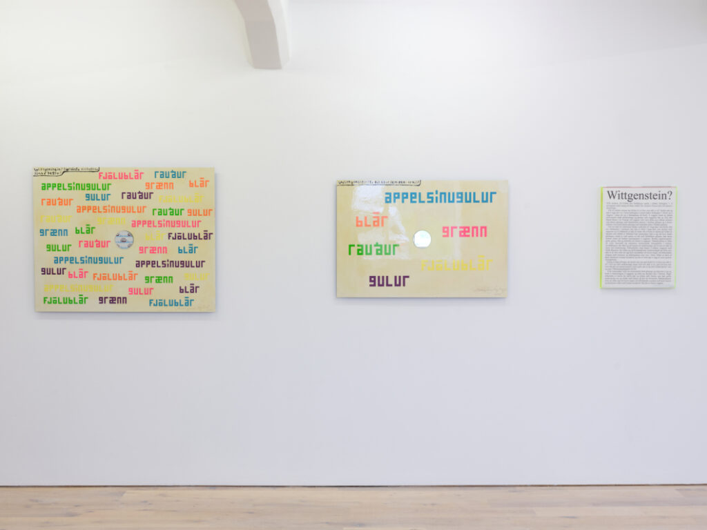 Í verkum Steingríms á sýningu hans Wittgenstein? & Félag um lifandi þjóðtrú koma fyrir textabrot og myndefni er vísa annarsvegar til íslenskrar þjóðtrúar og hinsvegar til skrifa heimspekingsins Ludwigs Wittgenstein, nánar tiltekið til rits hans, Bemerkungen über die Farben (Nokkur orð um liti), er hann ritaði ári fyrir andlát sitt, 1950. Í ritinu veltir Wittgenstein vöngum yfir tengslum sjónskynsins, lita, rökhugsunar og tungumálsins, þáttum er hann hafði skrifað um í gegnum allan sinn feril. Hann skoðar „gráa“ svæðið þar sem hugurinn tekur við af því sem augað nemur, af myndfleti eða í umhverfinu, þá liti er við teljum okkur skynja en eru í raun ekki til staðar og eru hugarsmíð okkar.